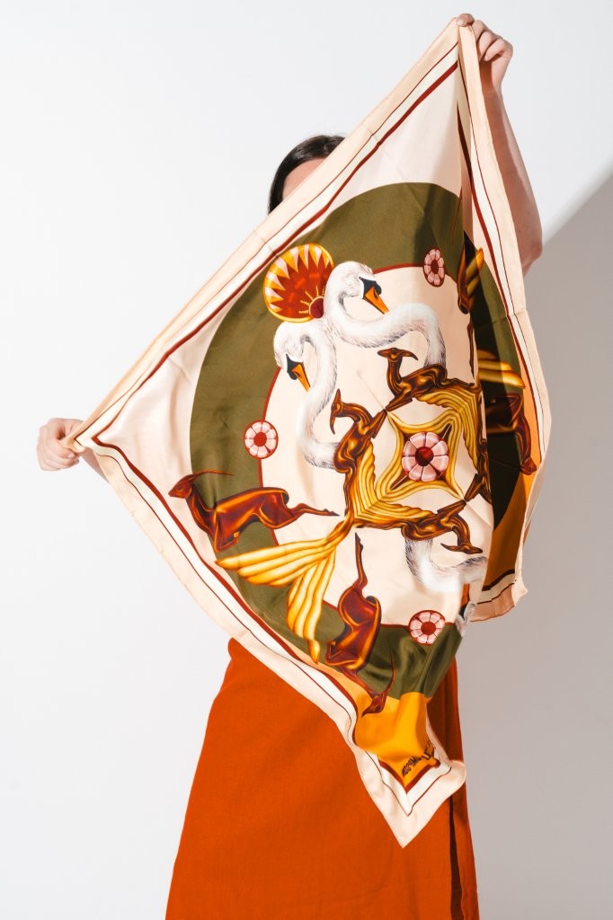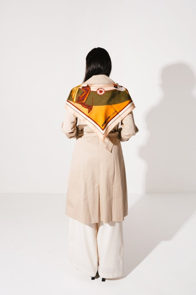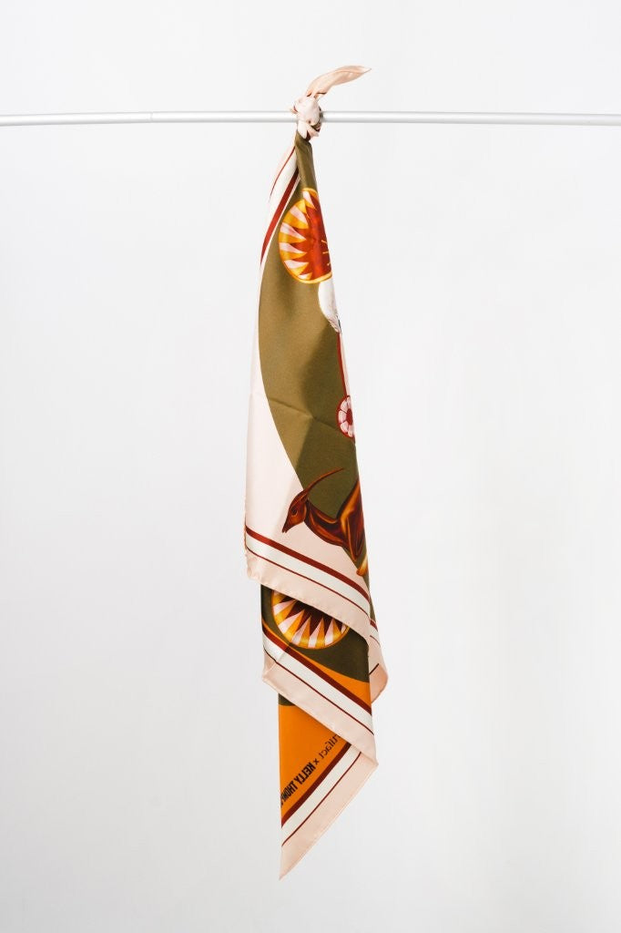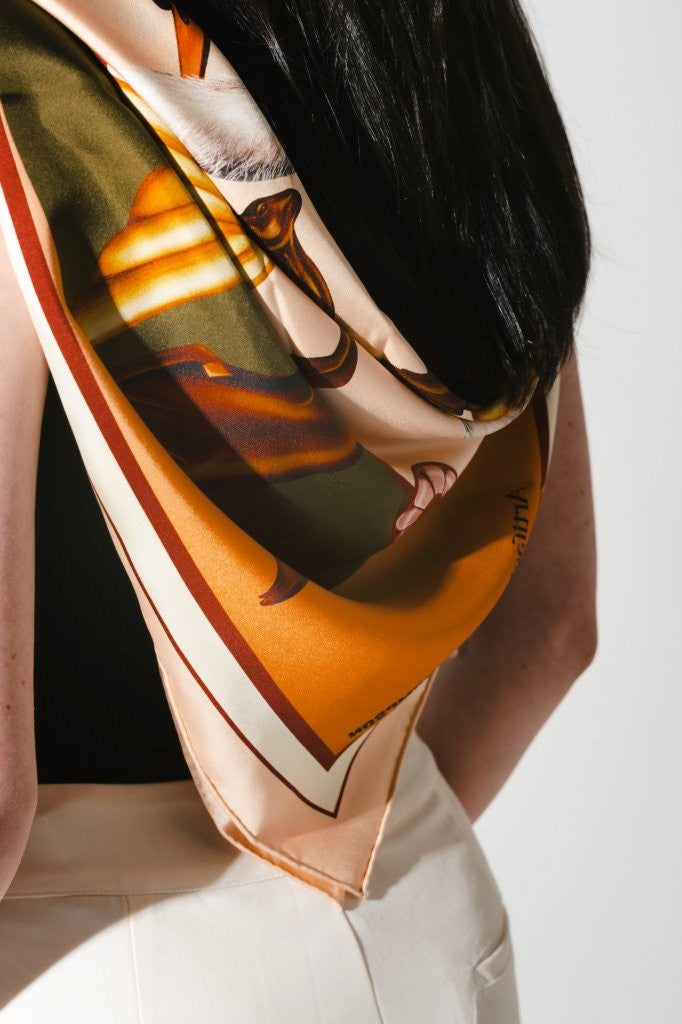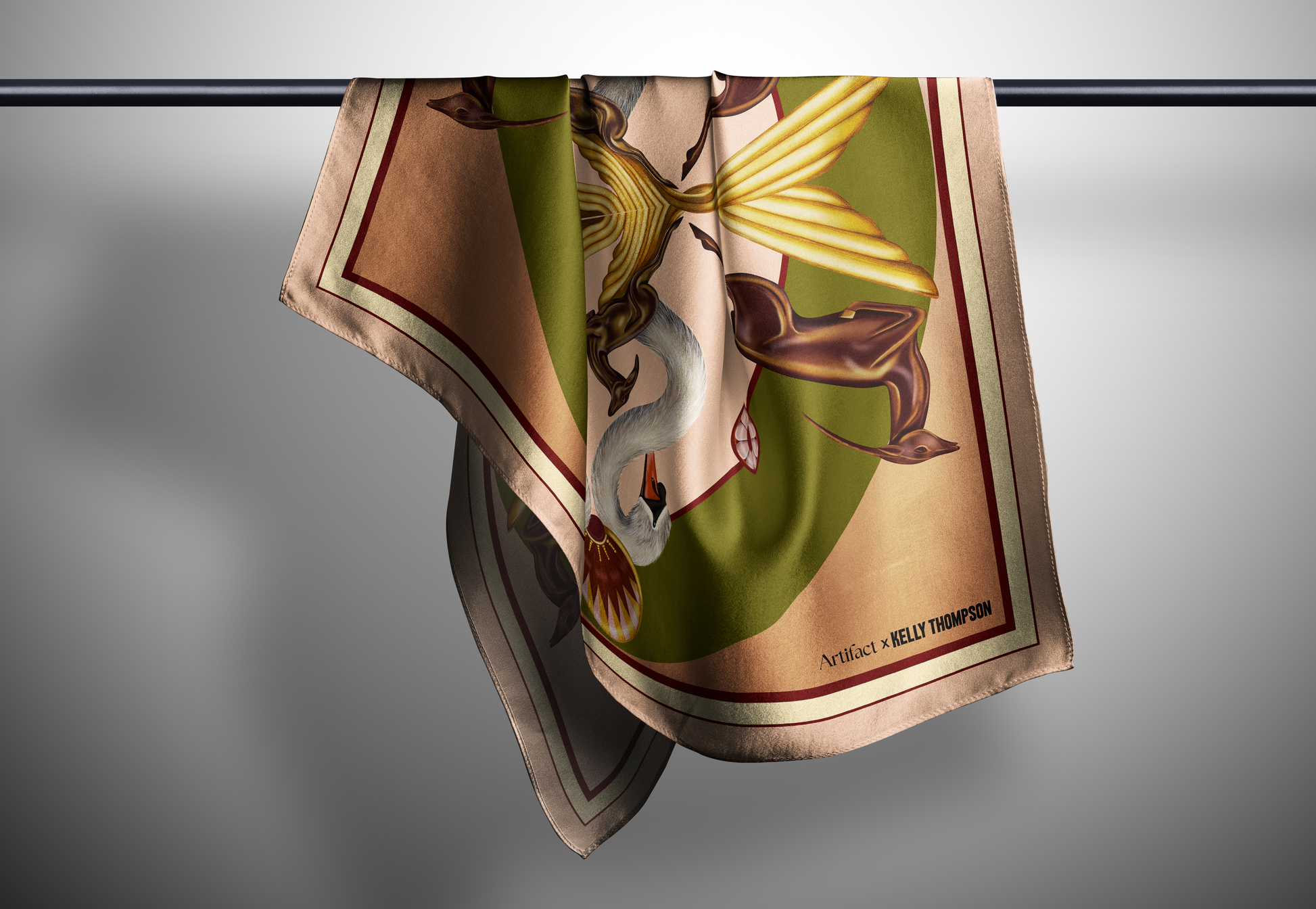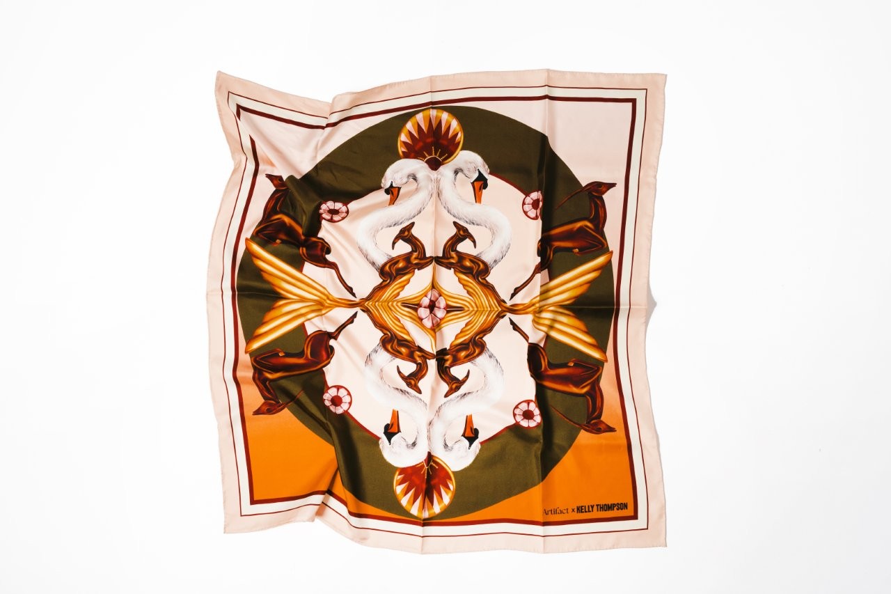 The Gilded scarf from the Artifact x Kelly Thompson Collection captures an elegant interplay of grace and strength — featuring swans, gazelles, and abstract golden forms arranged in perfect symmetry. This striking composition evokes movement and poise, a modern homage to nature’s beauty and balance.