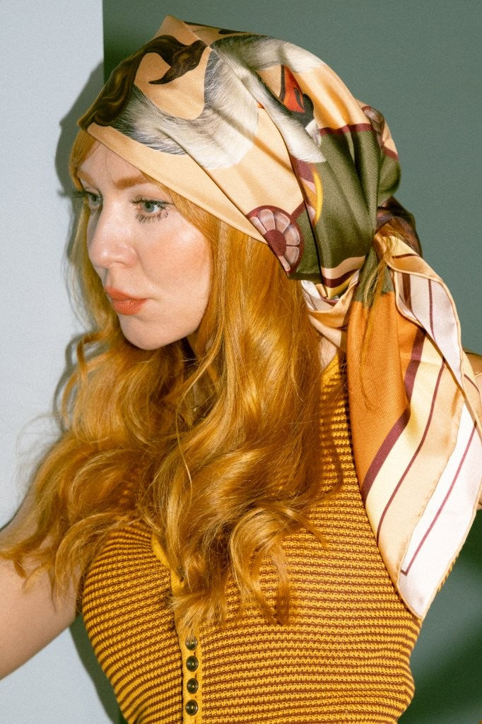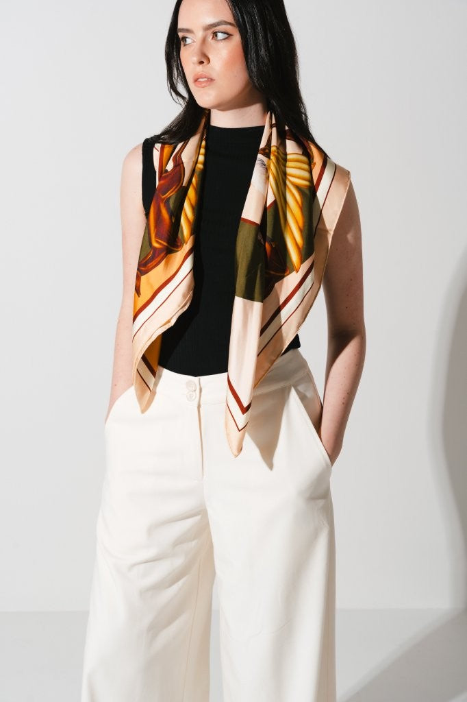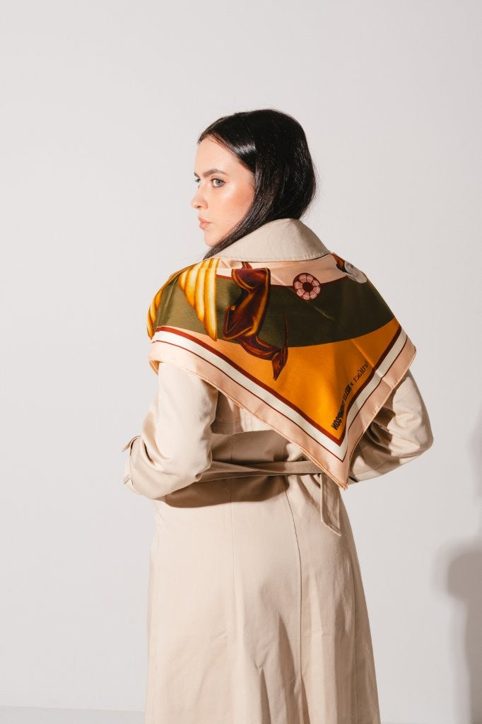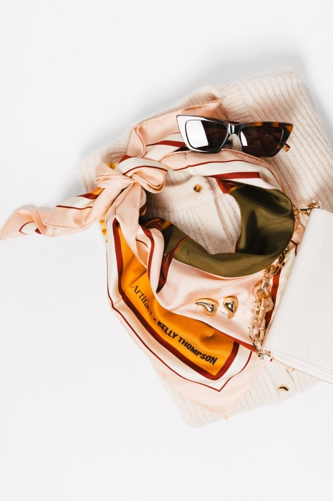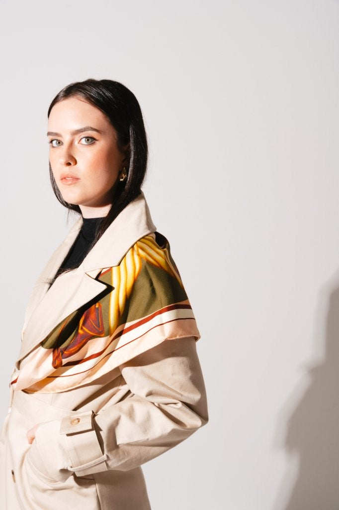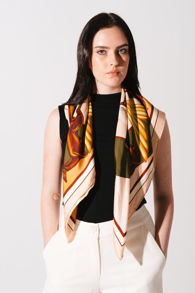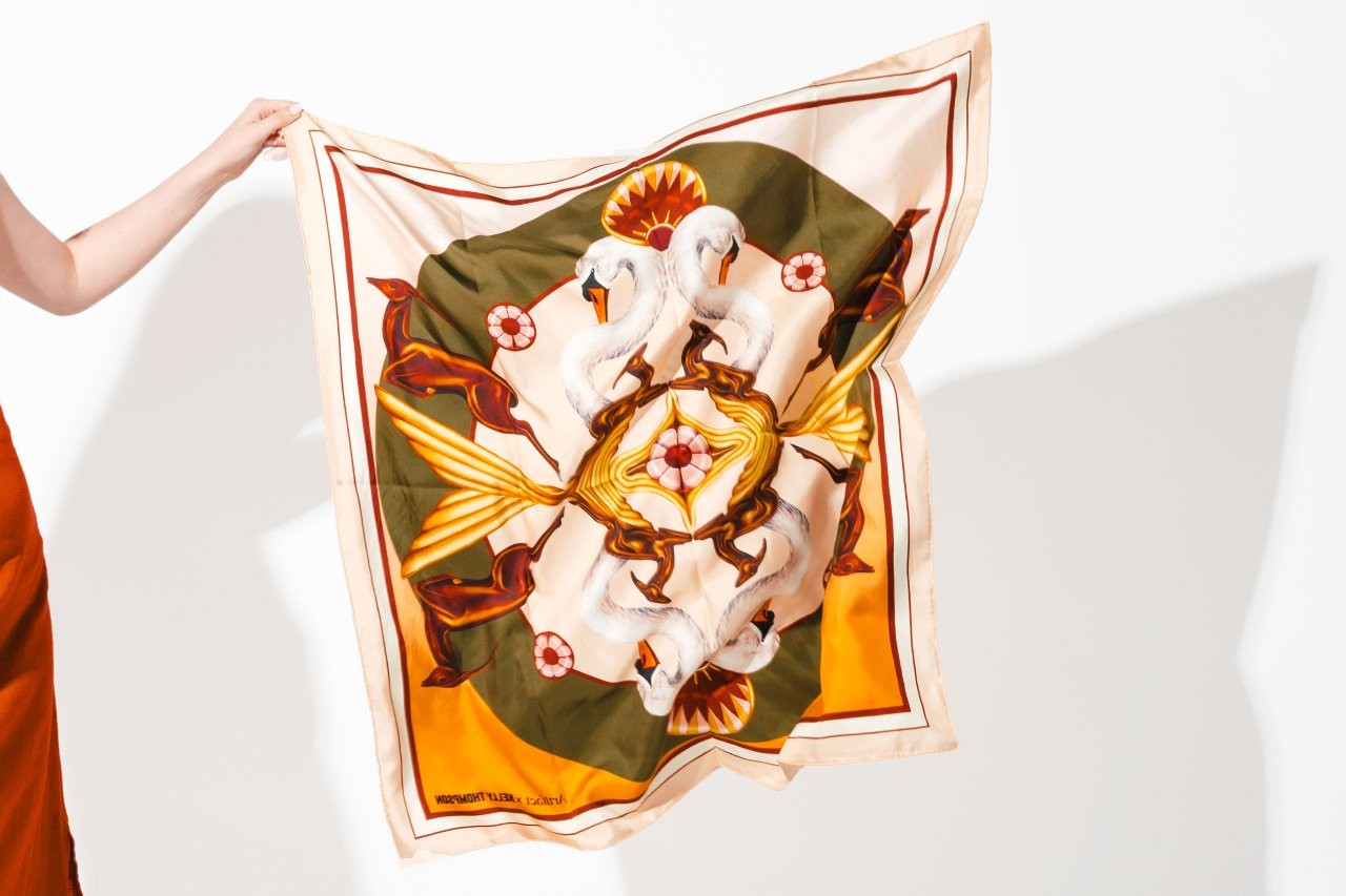 The Gilded scarf from the Artifact x Kelly Thompson Collection captures an elegant interplay of grace and strength — featuring swans, gazelles, and abstract golden forms arranged in perfect symmetry. This striking composition evokes movement and poise, a modern homage to nature’s beauty and balance.