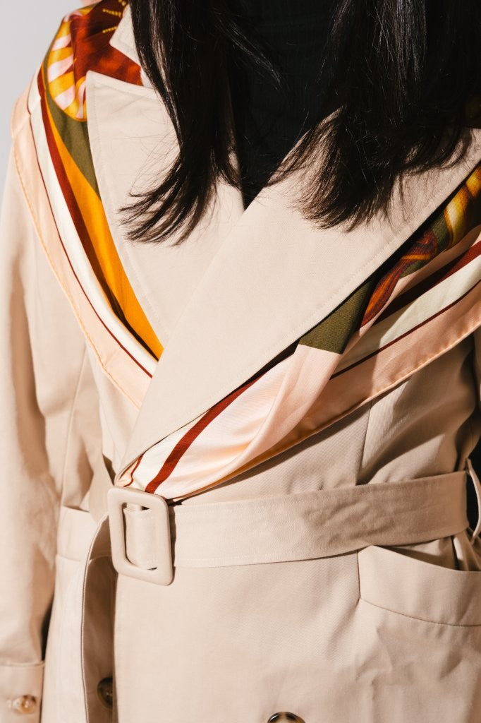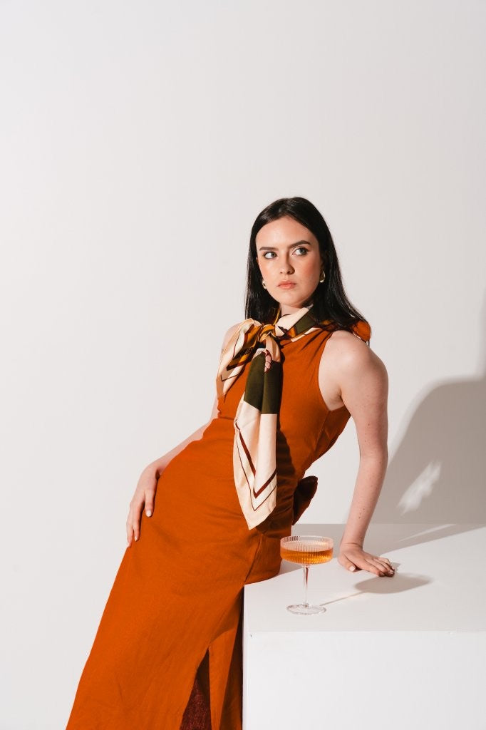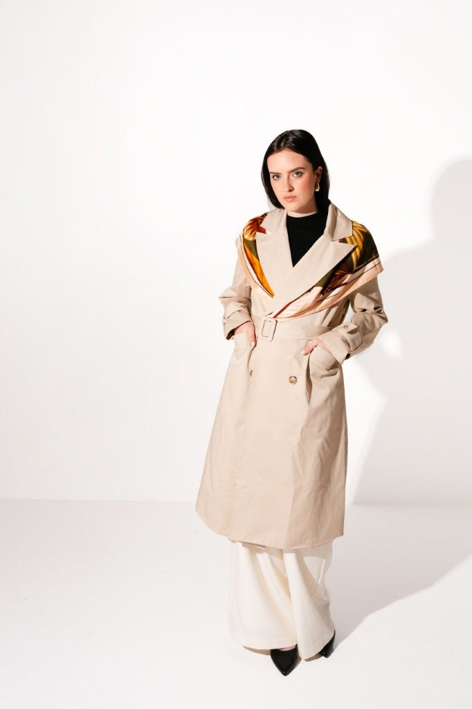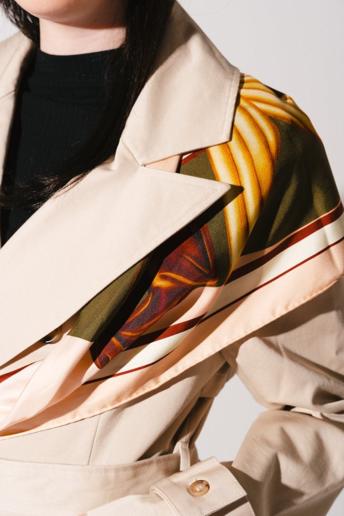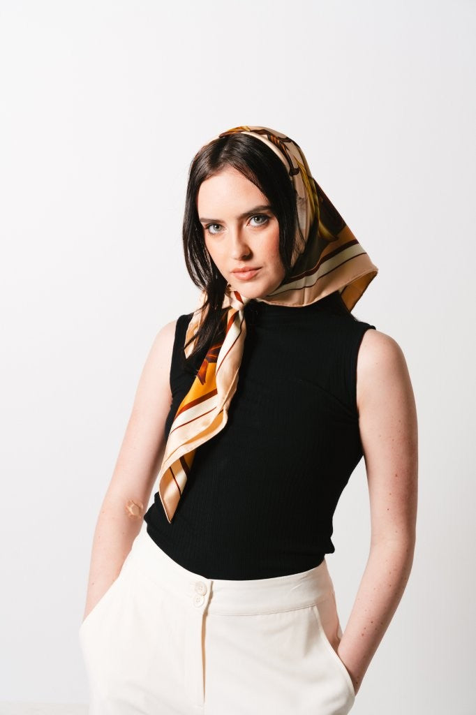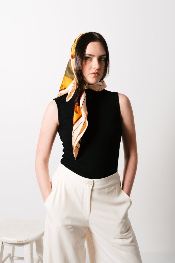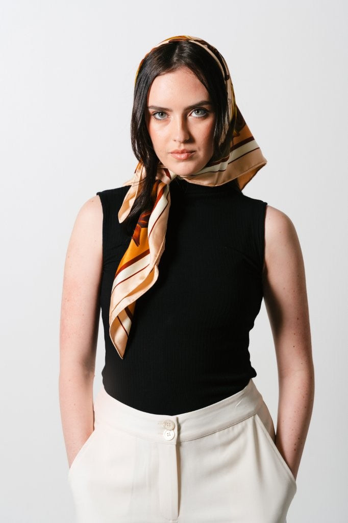 The Gilded scarf from the Artifact x Kelly Thompson Collection captures an elegant interplay of grace and strength — featuring swans, gazelles, and abstract golden forms arranged in perfect symmetry. This striking composition evokes movement and poise, a modern homage to nature’s beauty and balance.