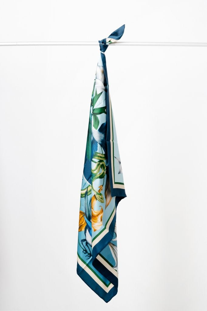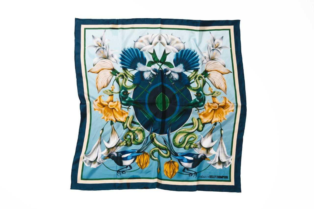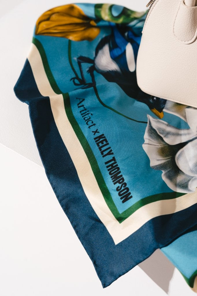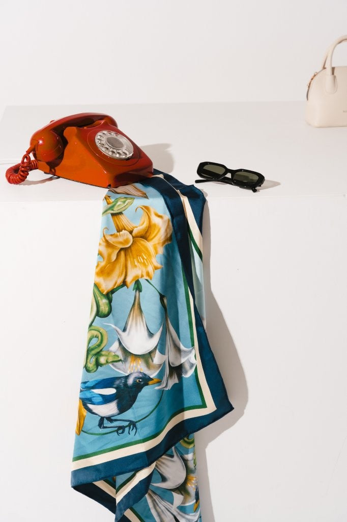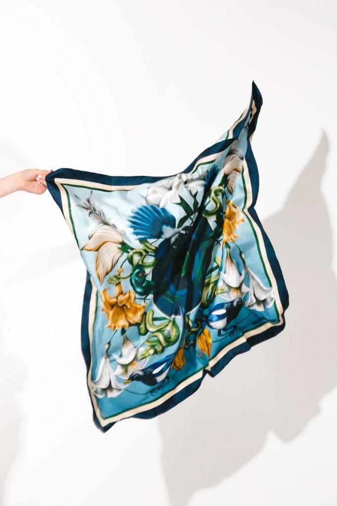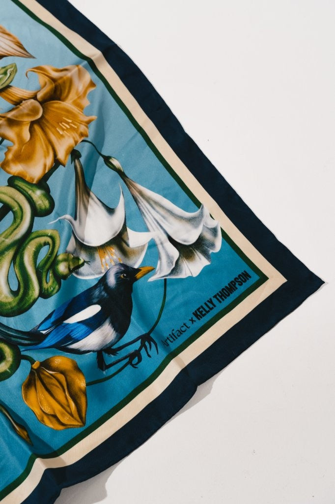 The Lush scarf from the Artifact x Kelly Thompson Collection is a celebration of vibrant flora and fauna - an exquisite artwork featuring birds entwined with trumpet-like blooms and flowing green vines, symbolising vitality and harmony.