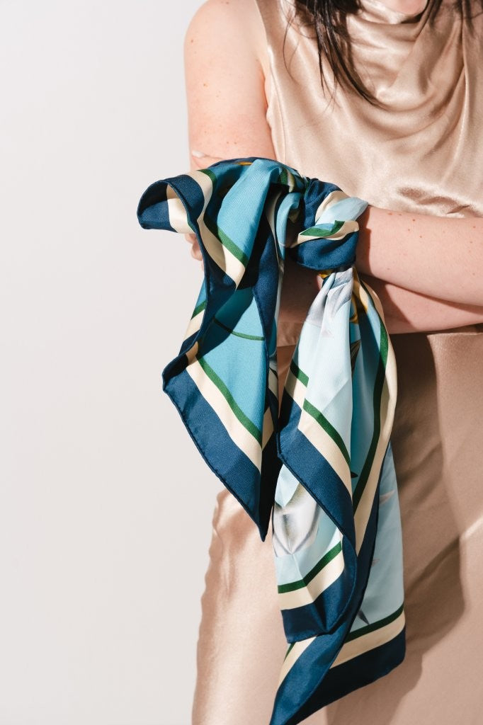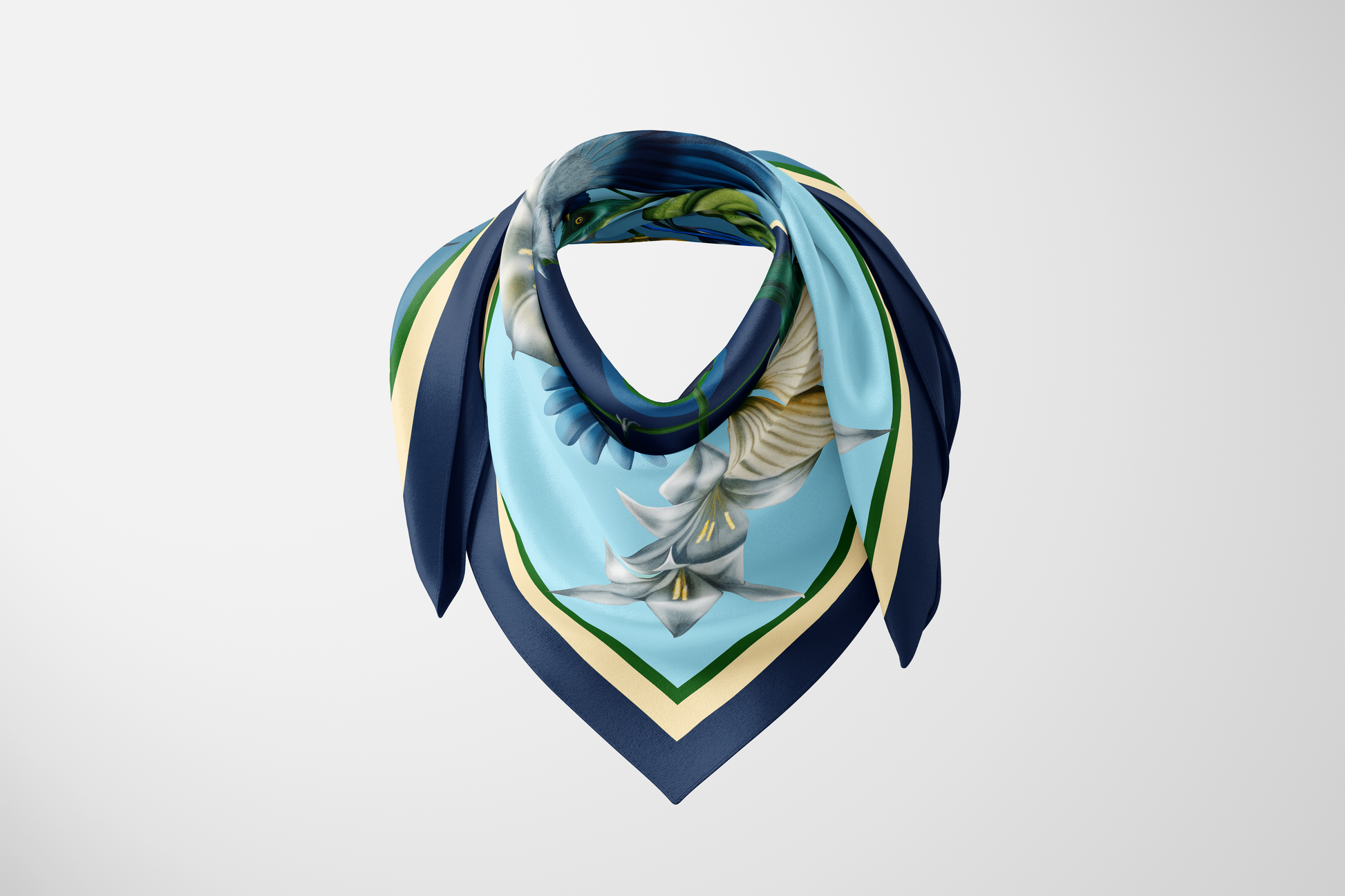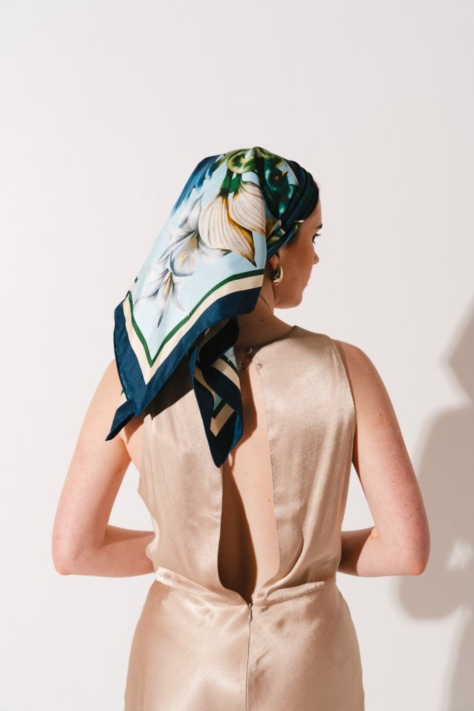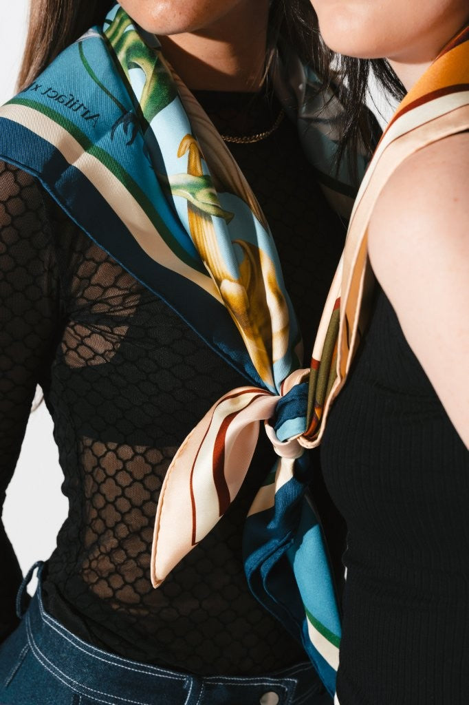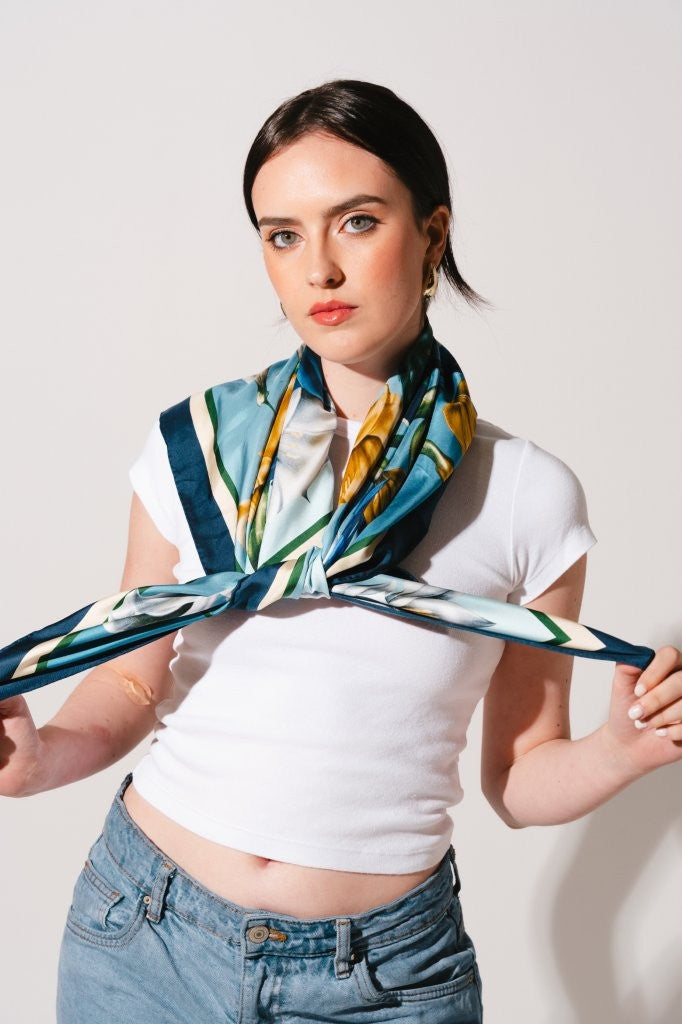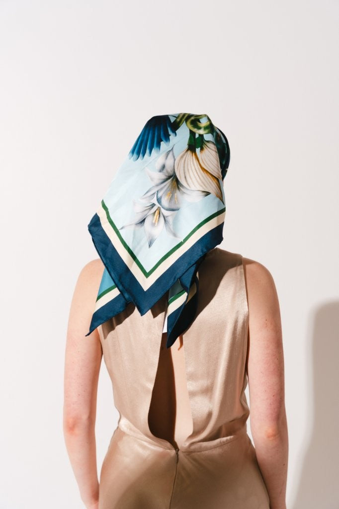The Lush scarf from the Artifact x Kelly Thompson Collection is a celebration of vibrant flora and fauna - an exquisite artwork featuring birds entwined with trumpet-like blooms and flowing green vines, symbolising vitality and harmony.