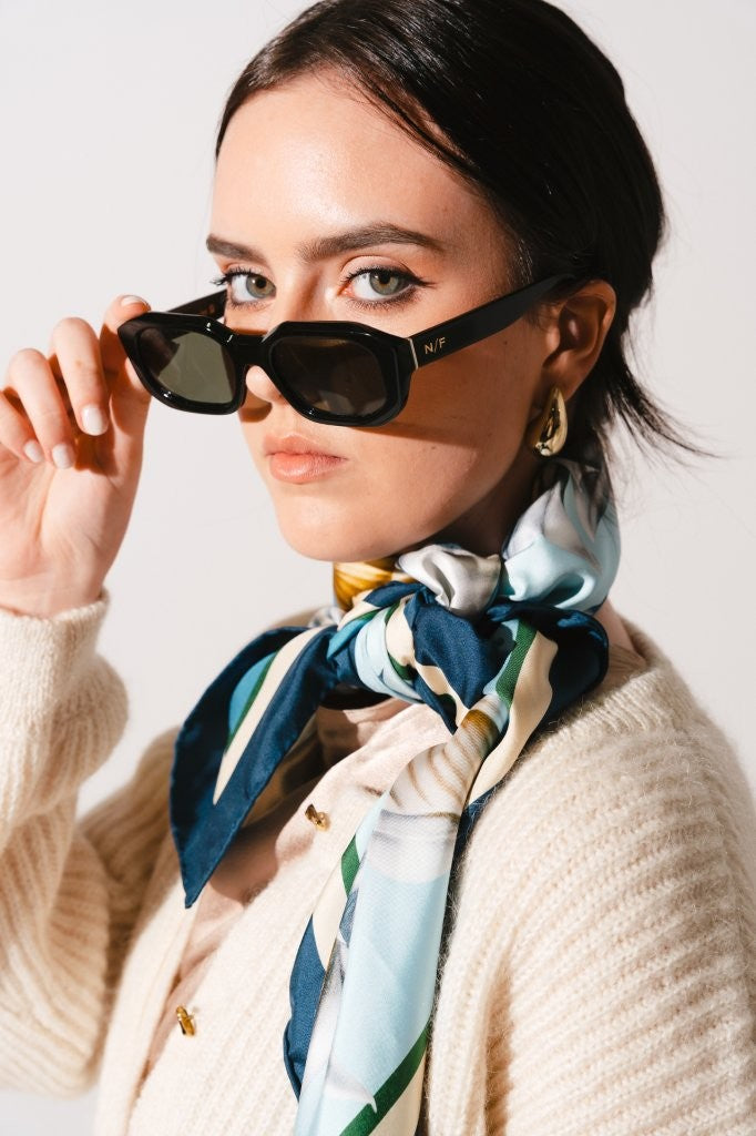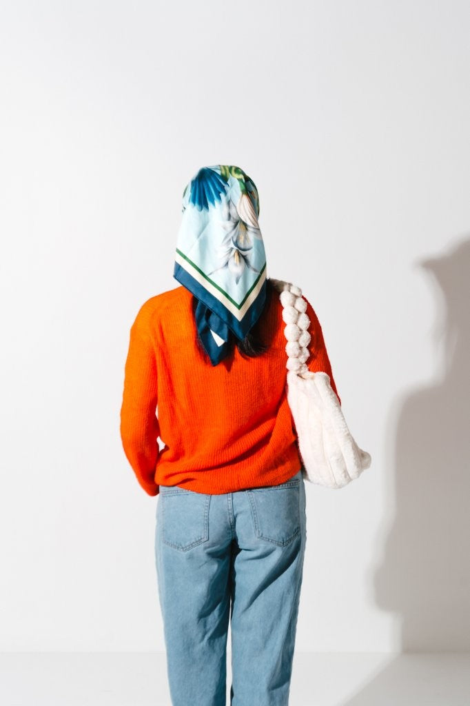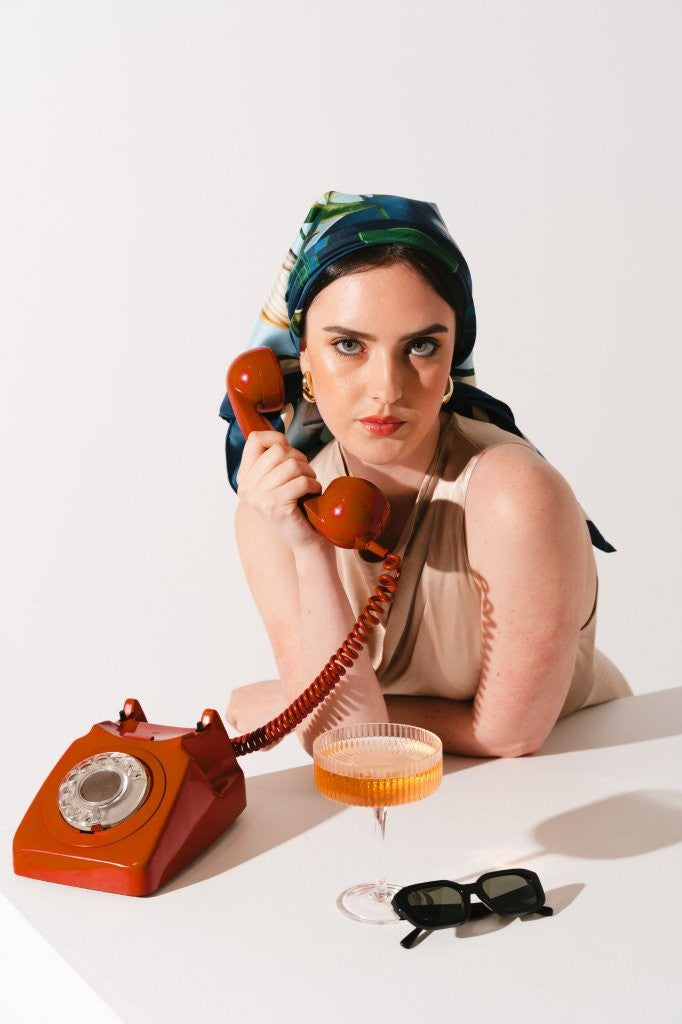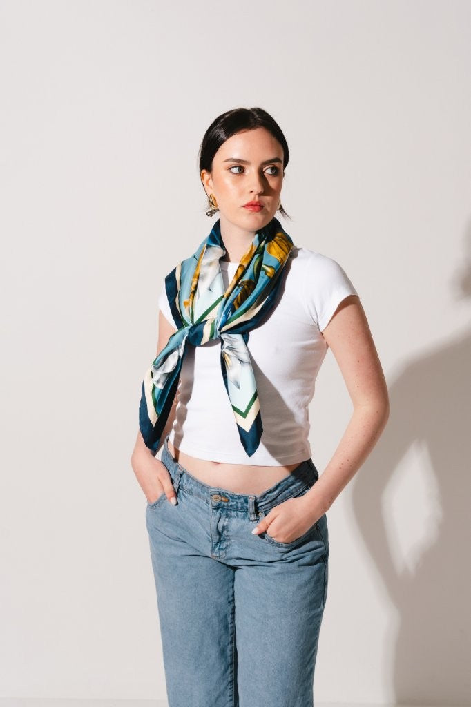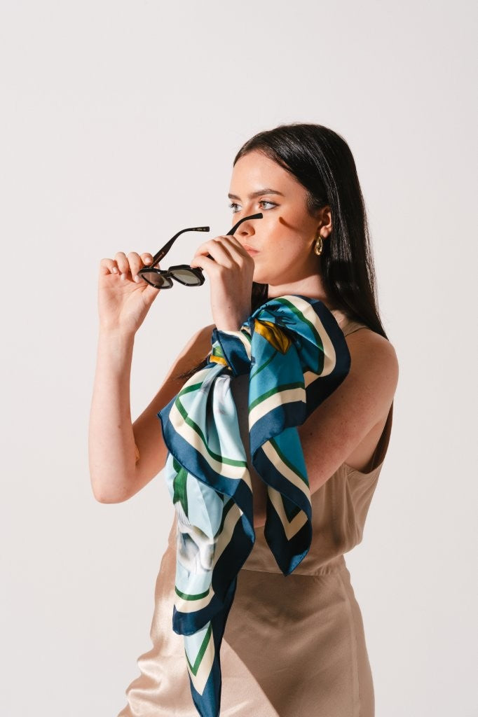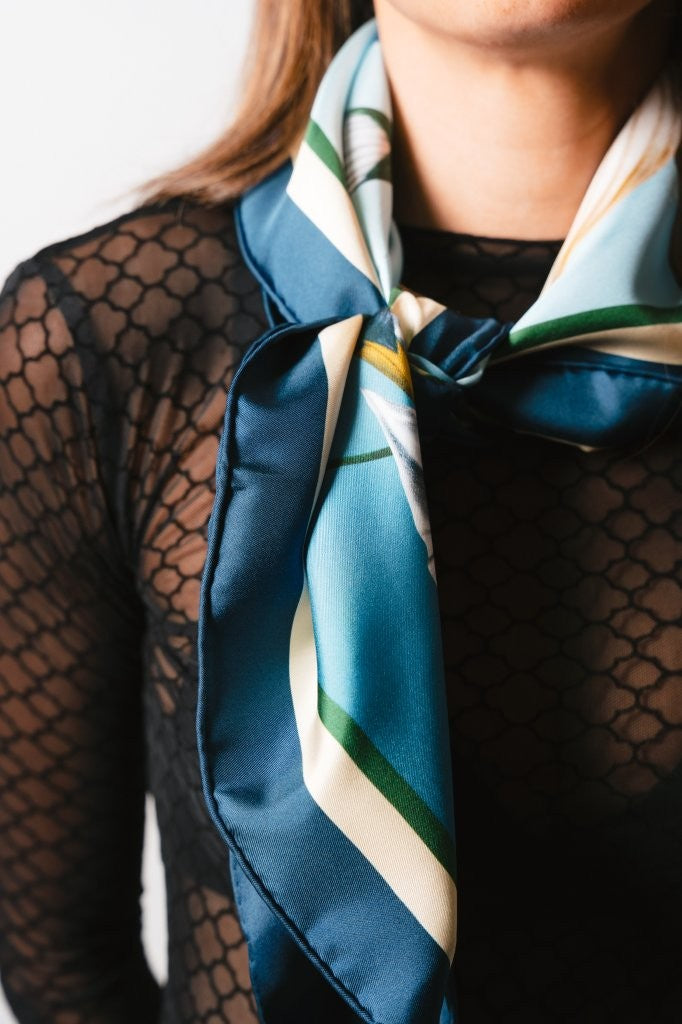 The Lush scarf from the Artifact x Kelly Thompson Collection is a celebration of vibrant flora and fauna - an exquisite artwork featuring birds entwined with trumpet-like blooms and flowing green vines, symbolising vitality and harmony.