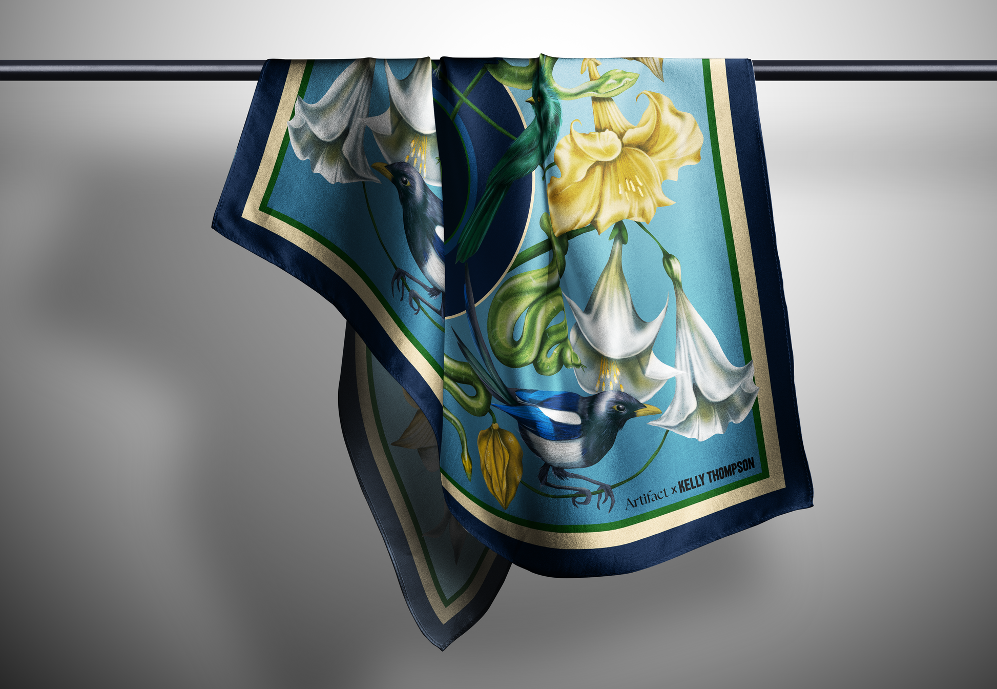 Crafted from luxurious 18mm silk twill, this 90 x 90cm square silk scarf offers an elegant drape and lustrous finish. Each limited-edition piece is detailed with hand-rolled hems, a double-sided print, and signature metal tags on all four corners — showcasing Artifact’s enduring commitment to artistry and craftsmanship.