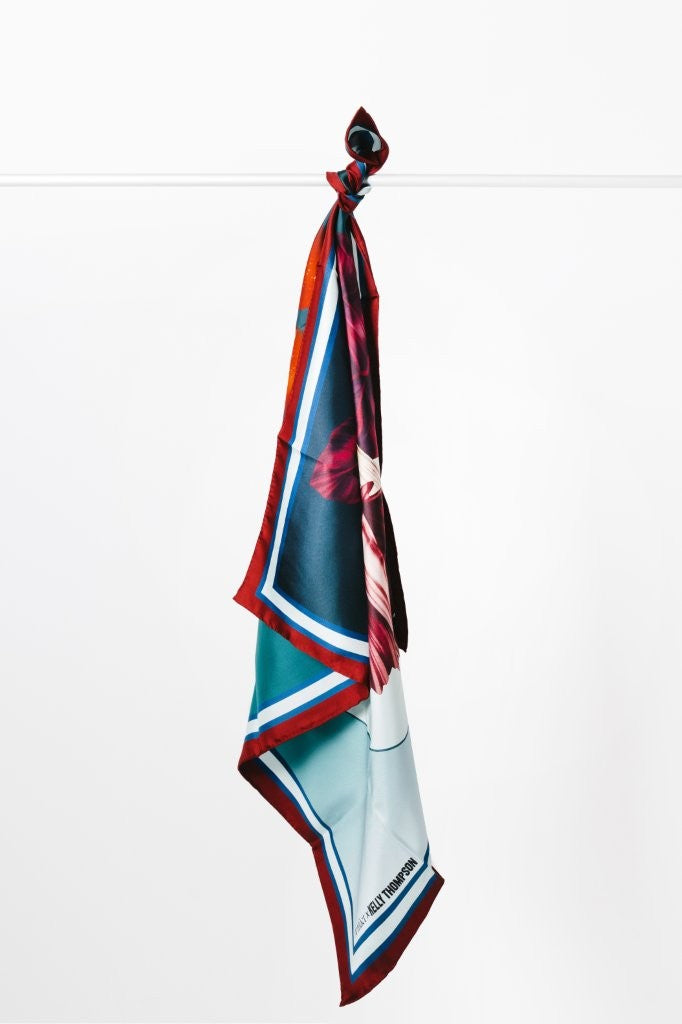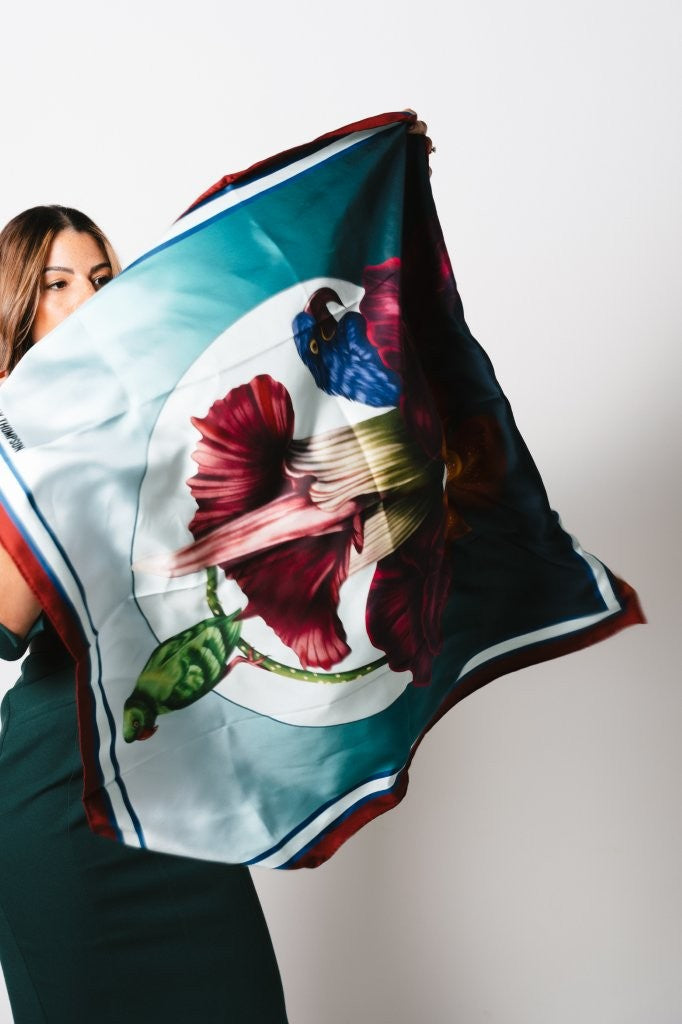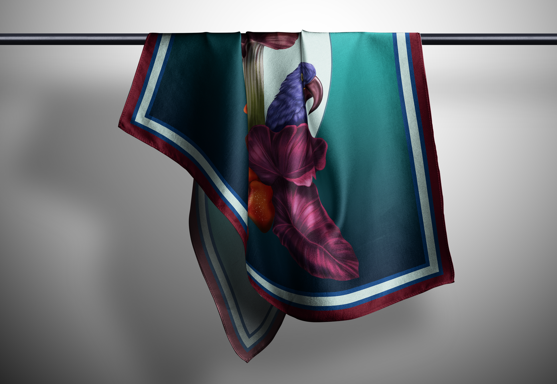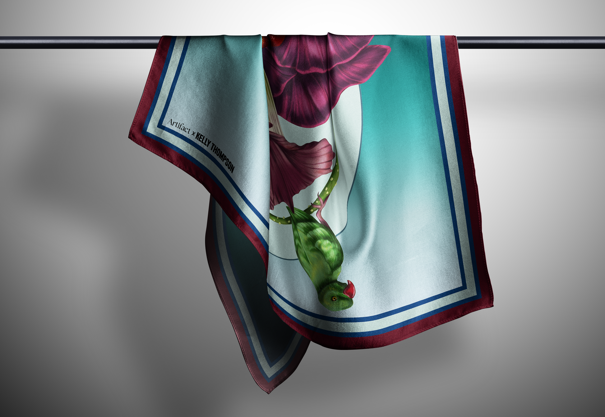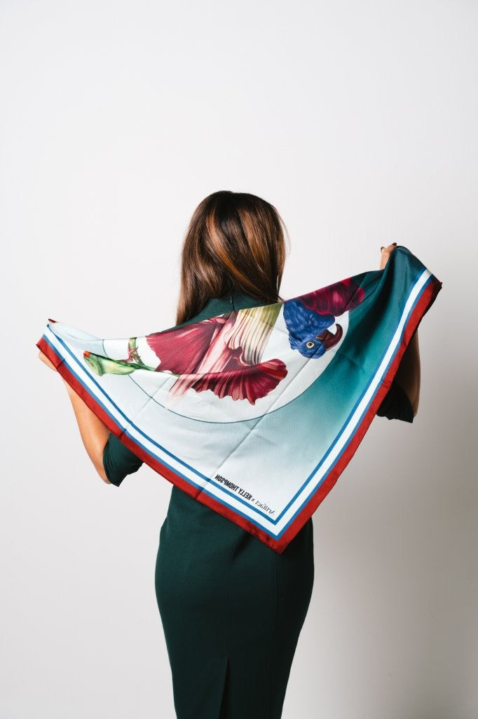 The Plume scarf from the Artifact x Kelly Thompson Collection is a bold study of contrast and colour - where exotic blooms meet vibrant parrots in a striking botanical composition. Rich emerald, violet, and crimson tones create a sense of depth and allure, celebrating the natural world through an artist’s lens.