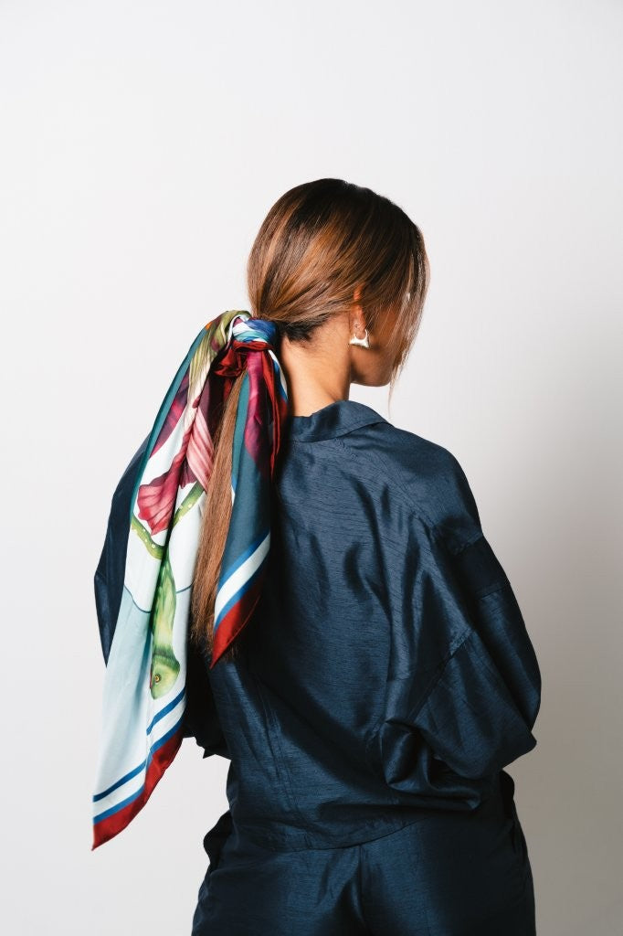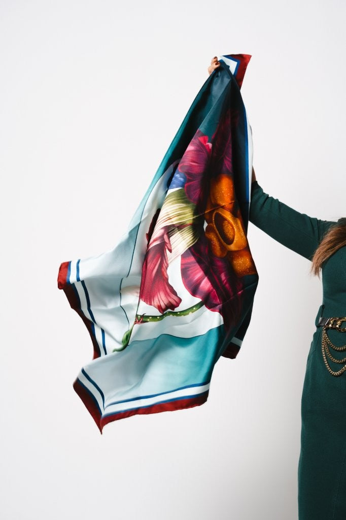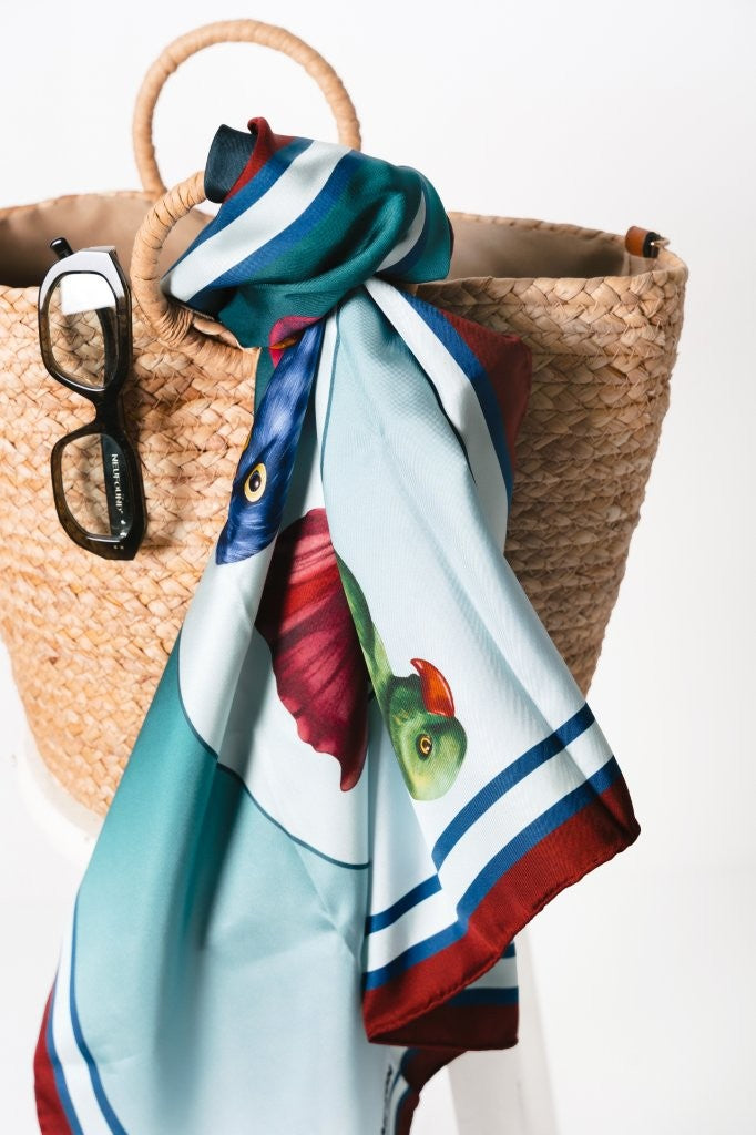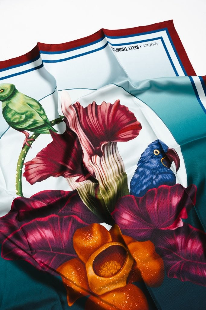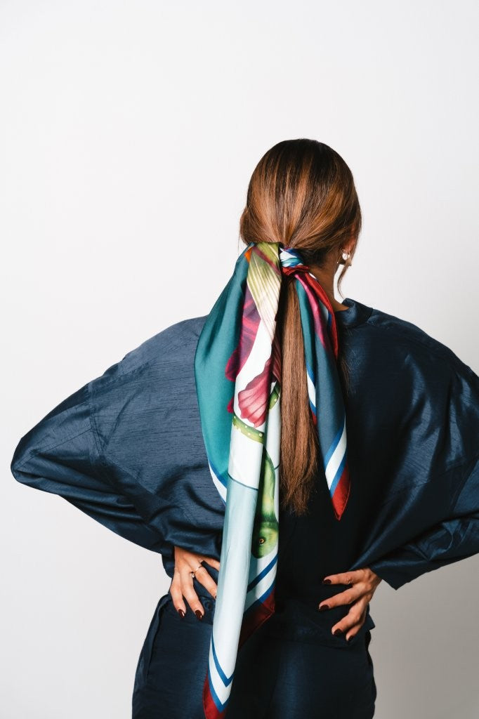 The Plume scarf from the Artifact x Kelly Thompson Collection is a bold study of contrast and colour - where exotic blooms meet vibrant parrots in a striking botanical composition. Rich emerald, violet, and crimson tones create a sense of depth and allure, celebrating the natural world through an artist’s lens.
