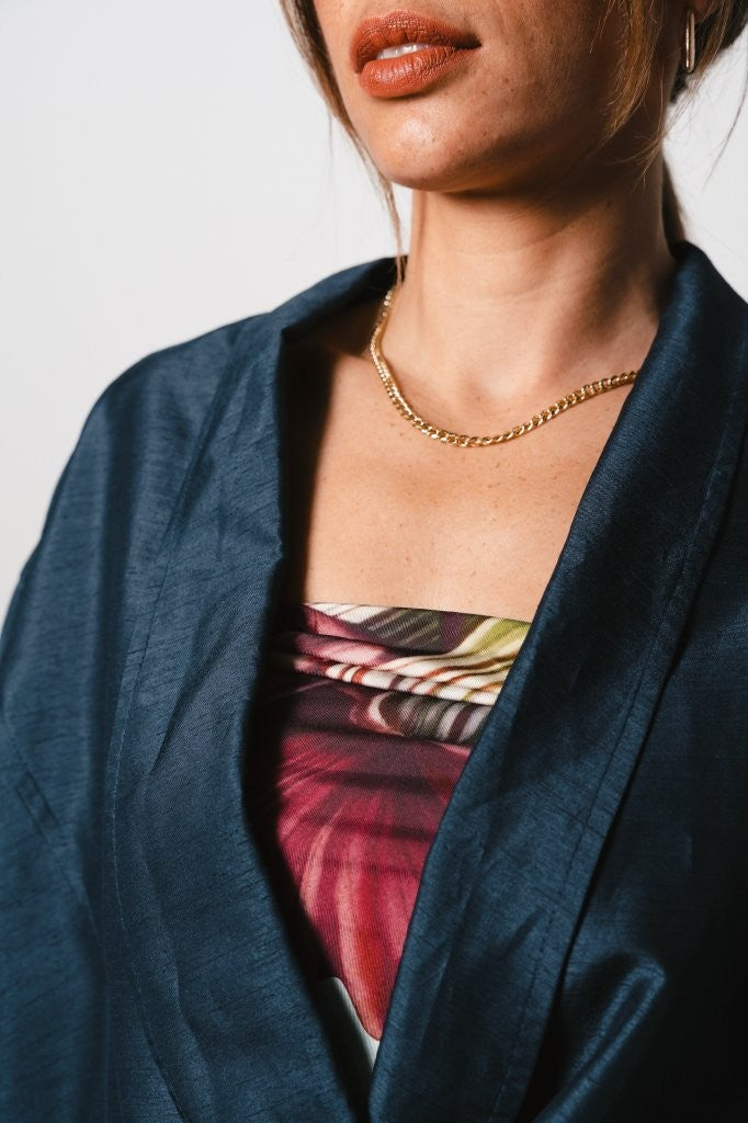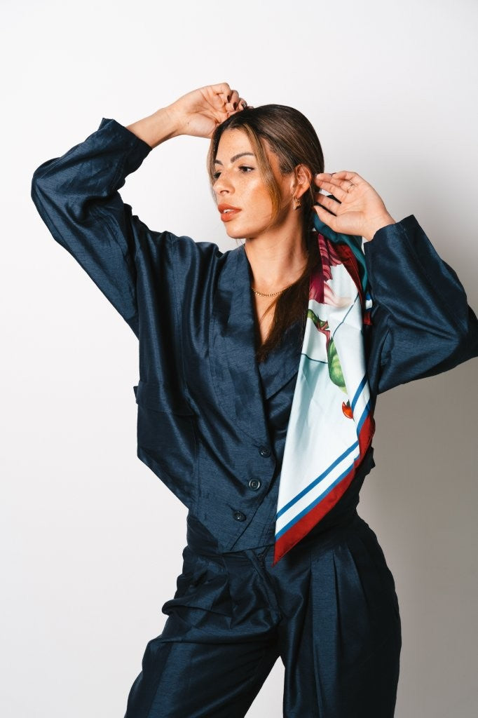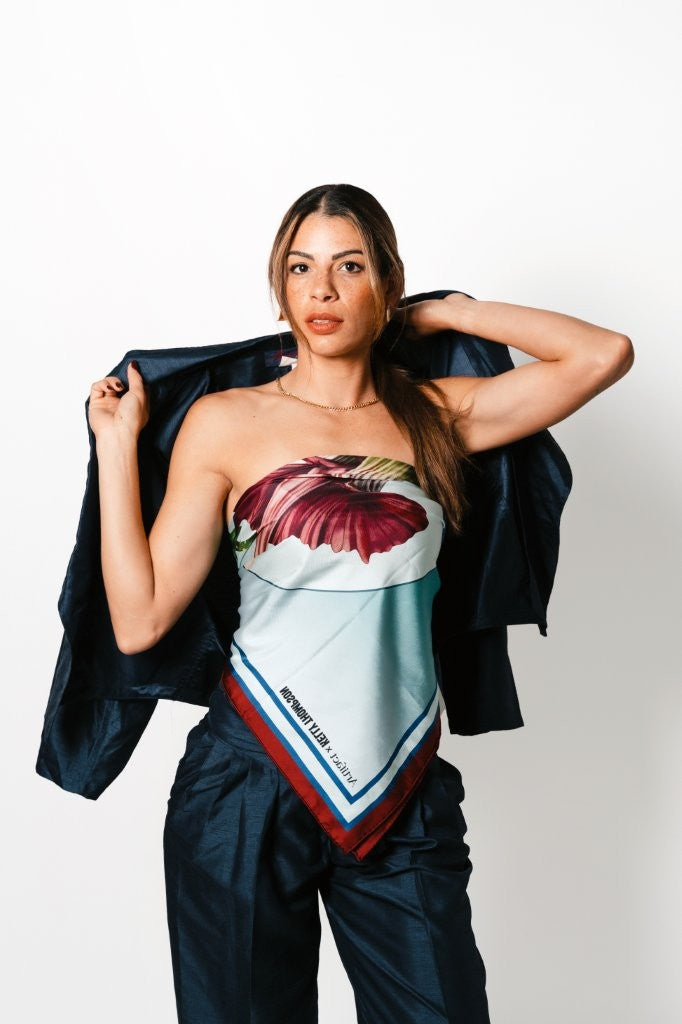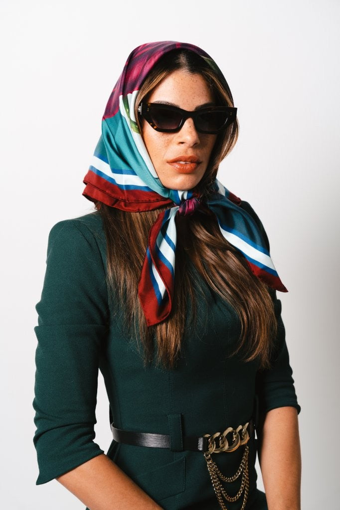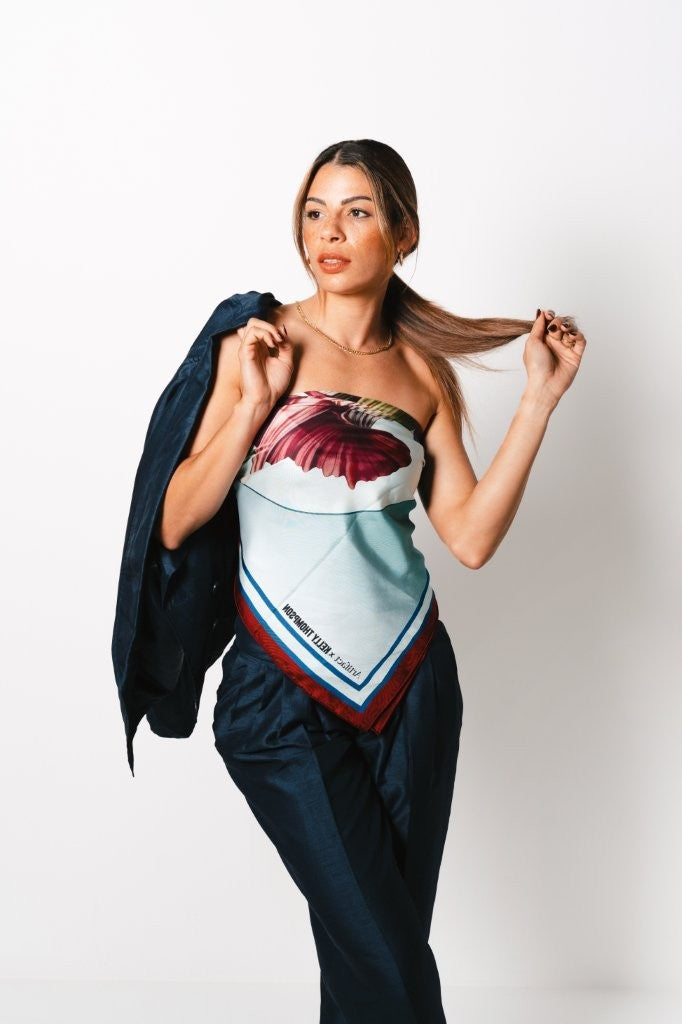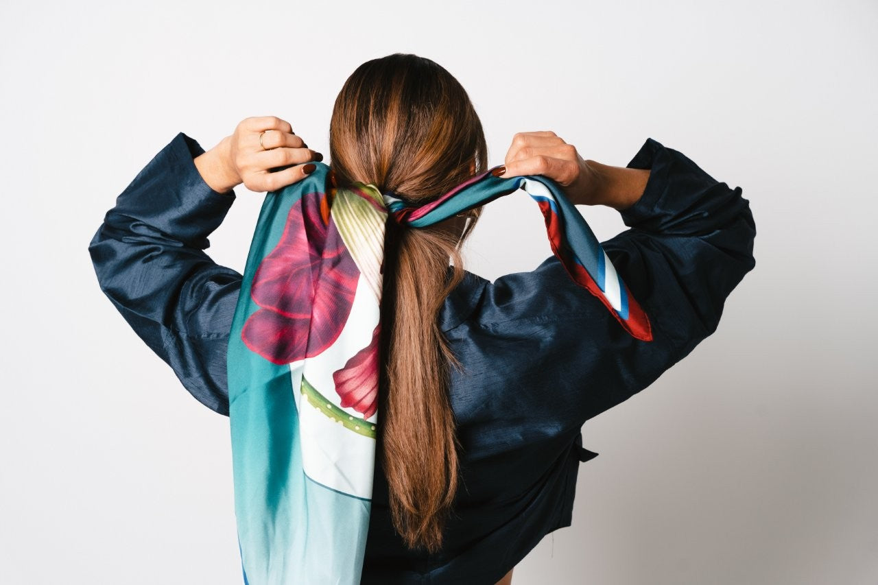 The Plume scarf from the Artifact x Kelly Thompson Collection is a bold study of contrast and colour - where exotic blooms meet vibrant parrots in a striking botanical composition. Rich emerald, violet, and crimson tones create a sense of depth and allure, celebrating the natural world through an artist’s lens.