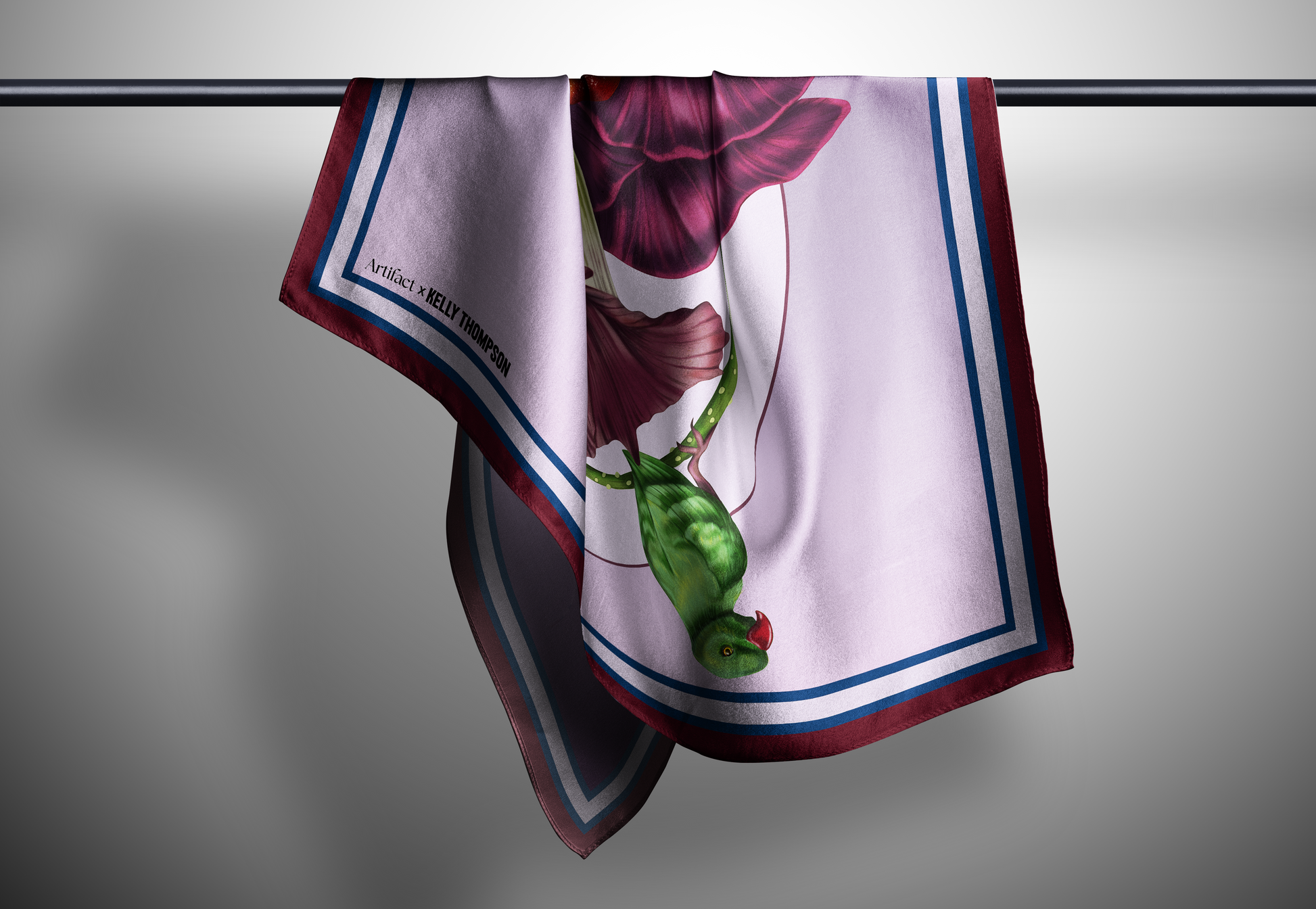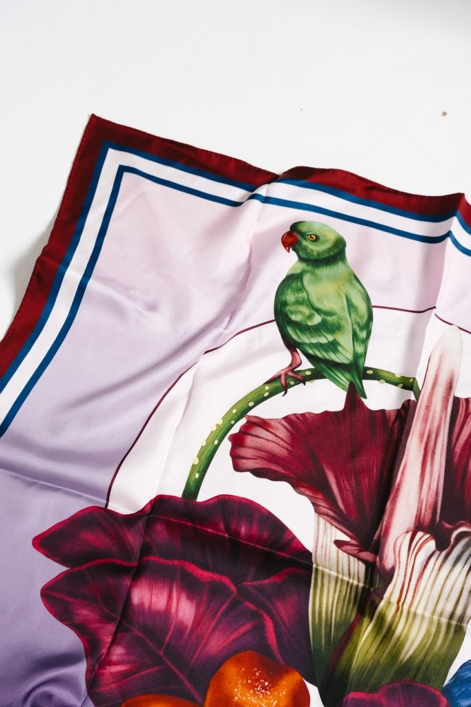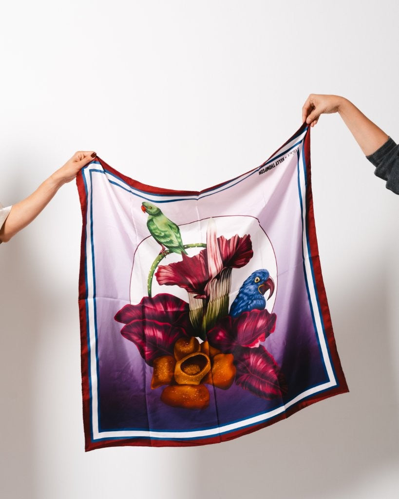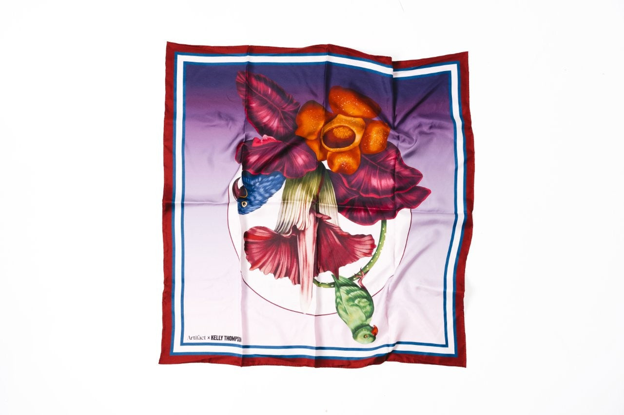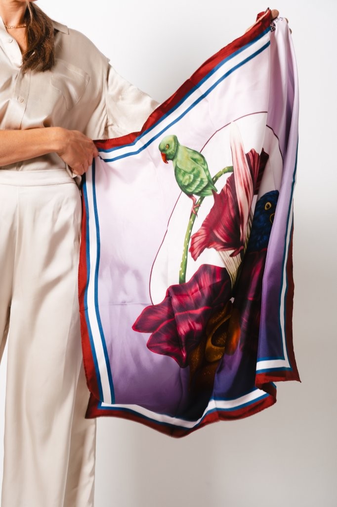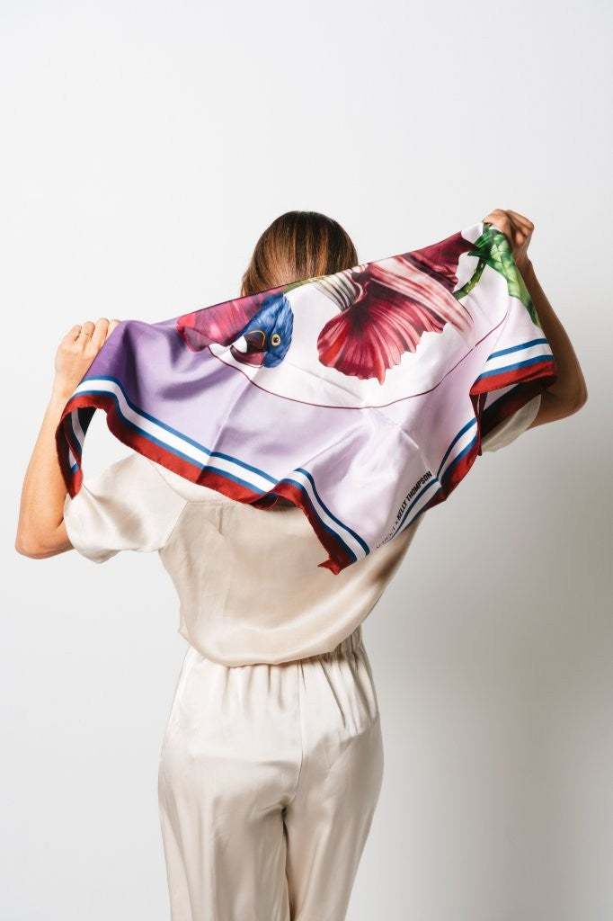 The Plume Plum scarf from the Artifact x Kelly Thompson Collection is a captivating reimagining of the original Plume design, infused with deep plum, violet, and ruby hues. Exotic blooms unfold alongside vibrant parrots, creating a bold botanical tableau that celebrates the harmony between art, nature, and colour.