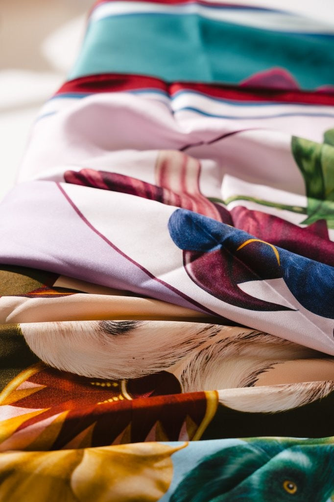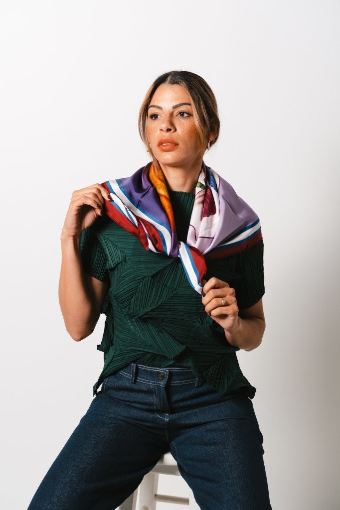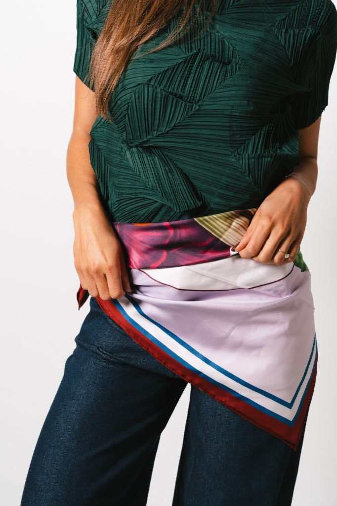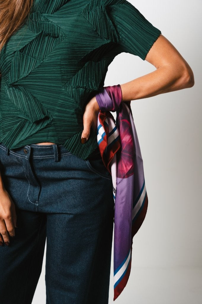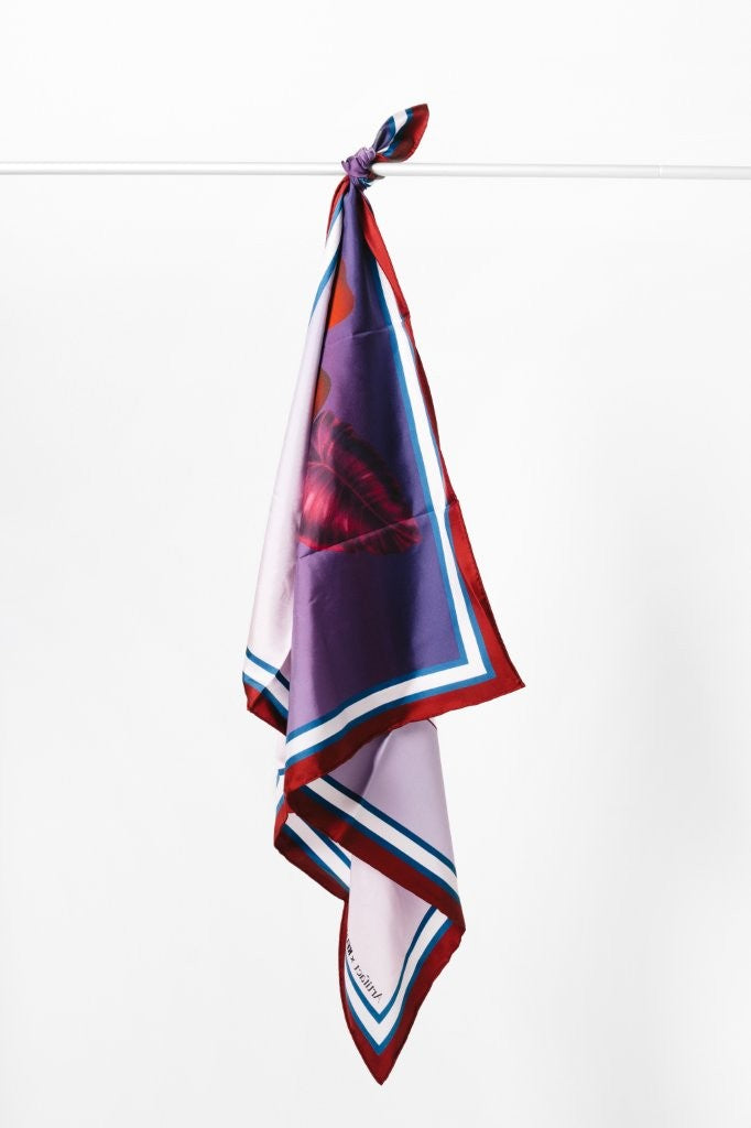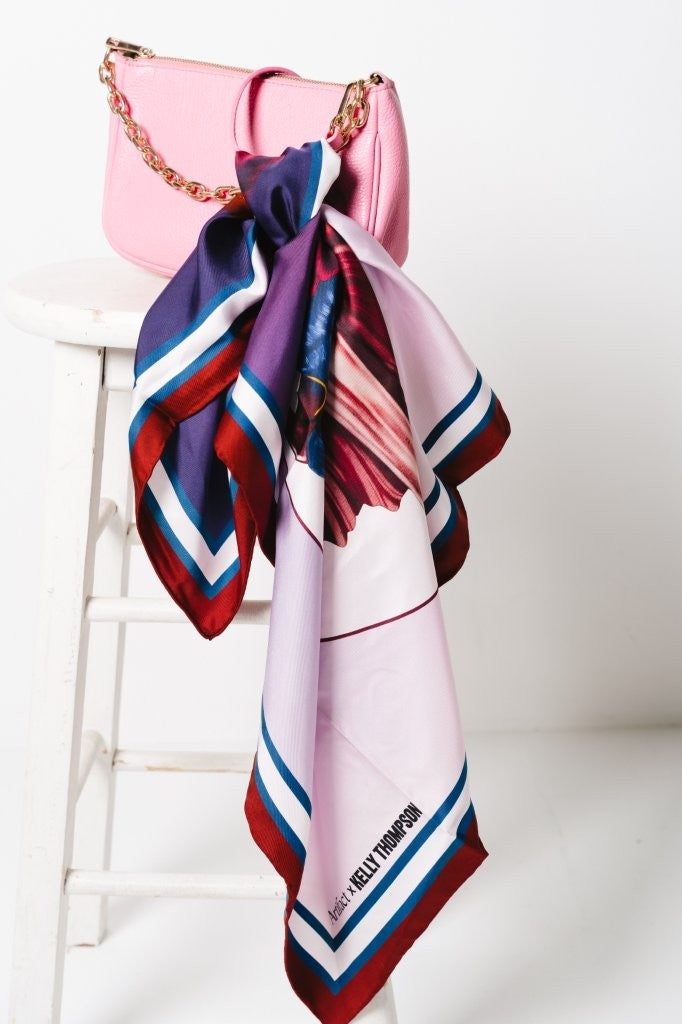 The Plume Plum scarf from the Artifact x Kelly Thompson Collection is a captivating reimagining of the original Plume design, infused with deep plum, violet, and ruby hues. Exotic blooms unfold alongside vibrant parrots, creating a bold botanical tableau that celebrates the harmony between art, nature, and colour.