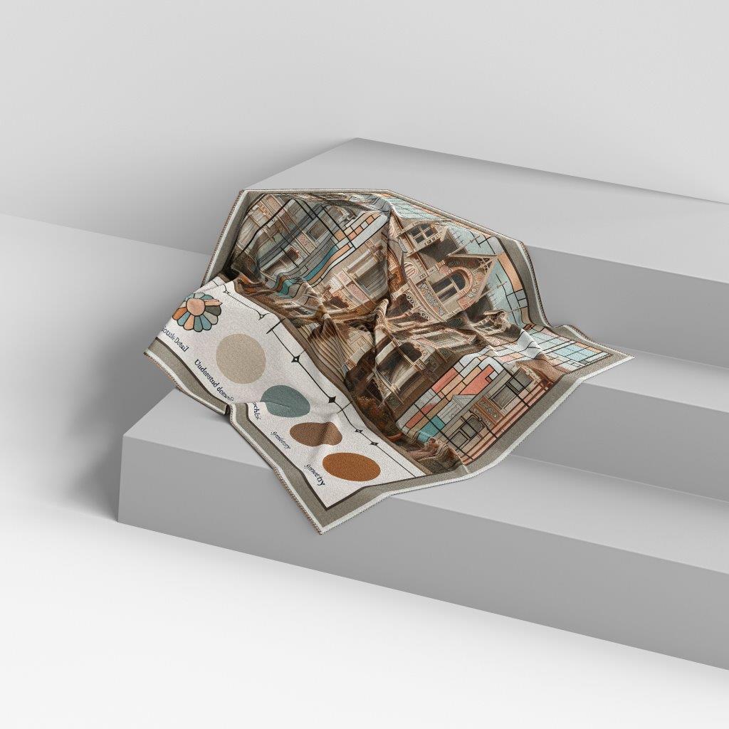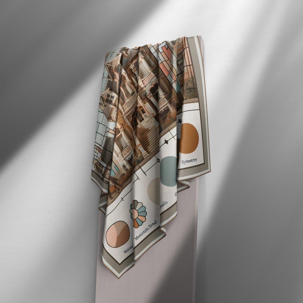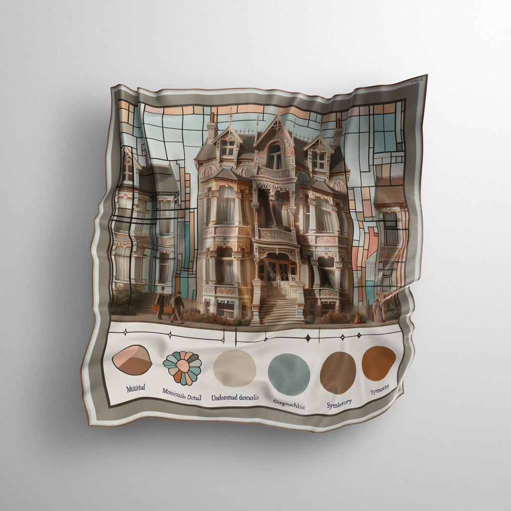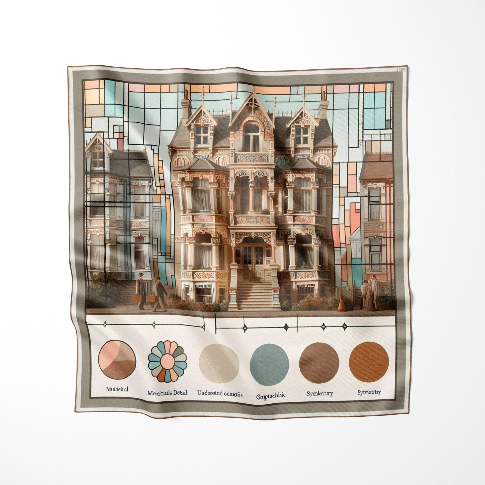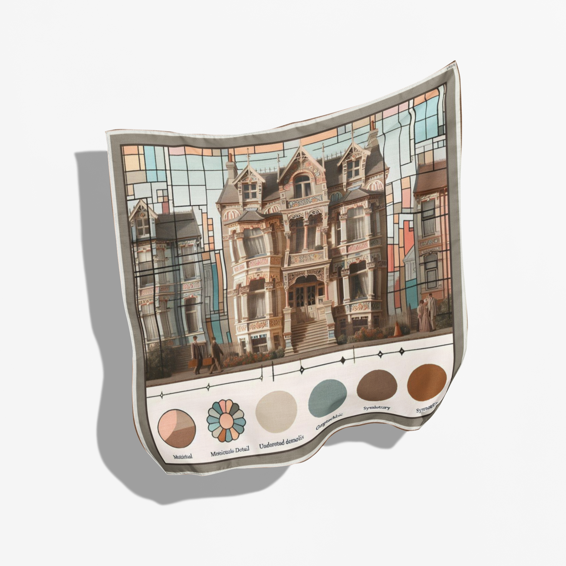 Introducing "Residence," a 90x90cm Silk Scarf designed exclusively for ladies, blending vintage opulence with contemporary artistry. Meticulously crafted from premium silk twill and finished with a rolled hem, this luxurious scarf showcases an intricate Victorian residence with a modern color-blocked twist. Combining shades of linen, sage green, and tan, it offers a fresh interpretation of timeless architectural beauty, creating a wearable masterpiece ideal for women seeking sophistication in their silk scarves.
