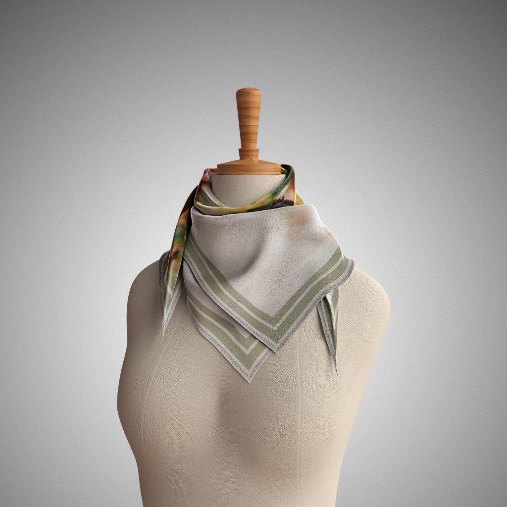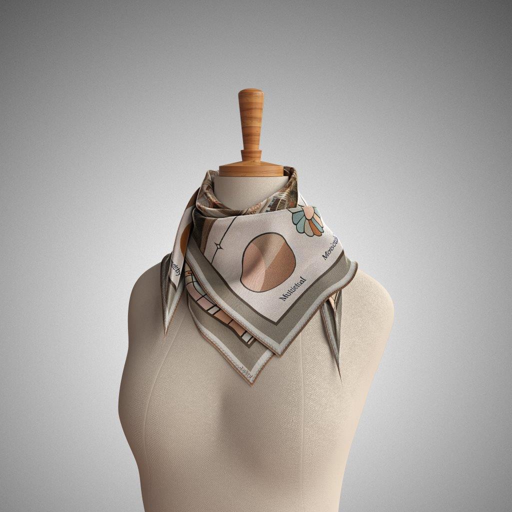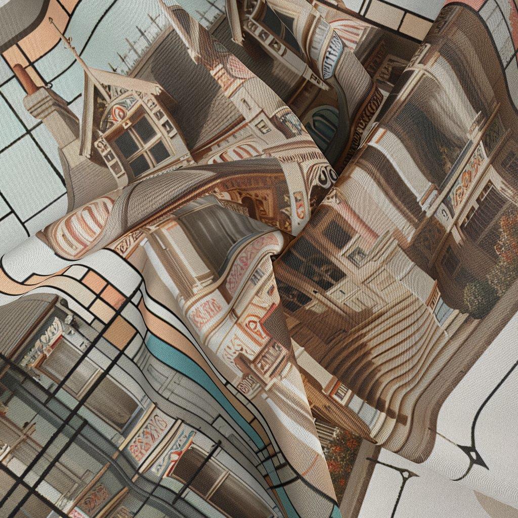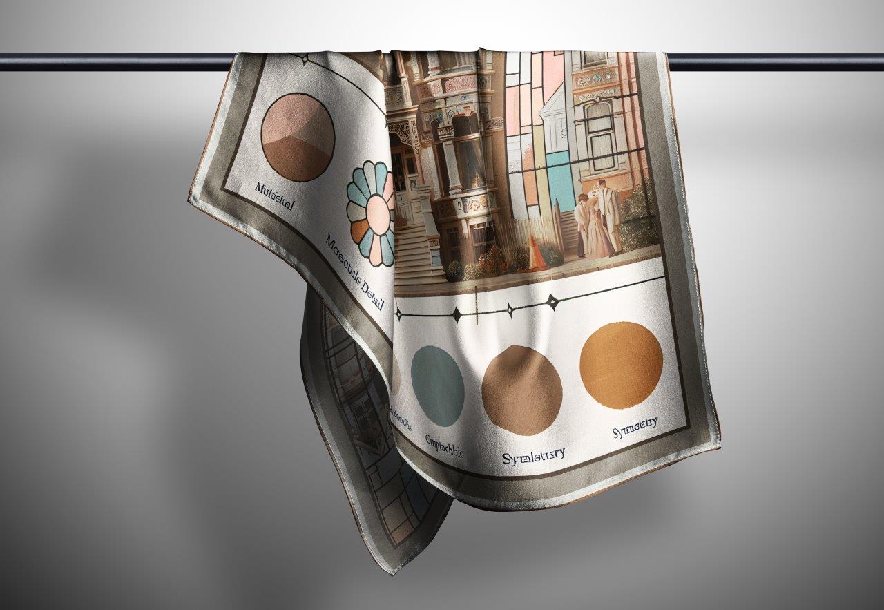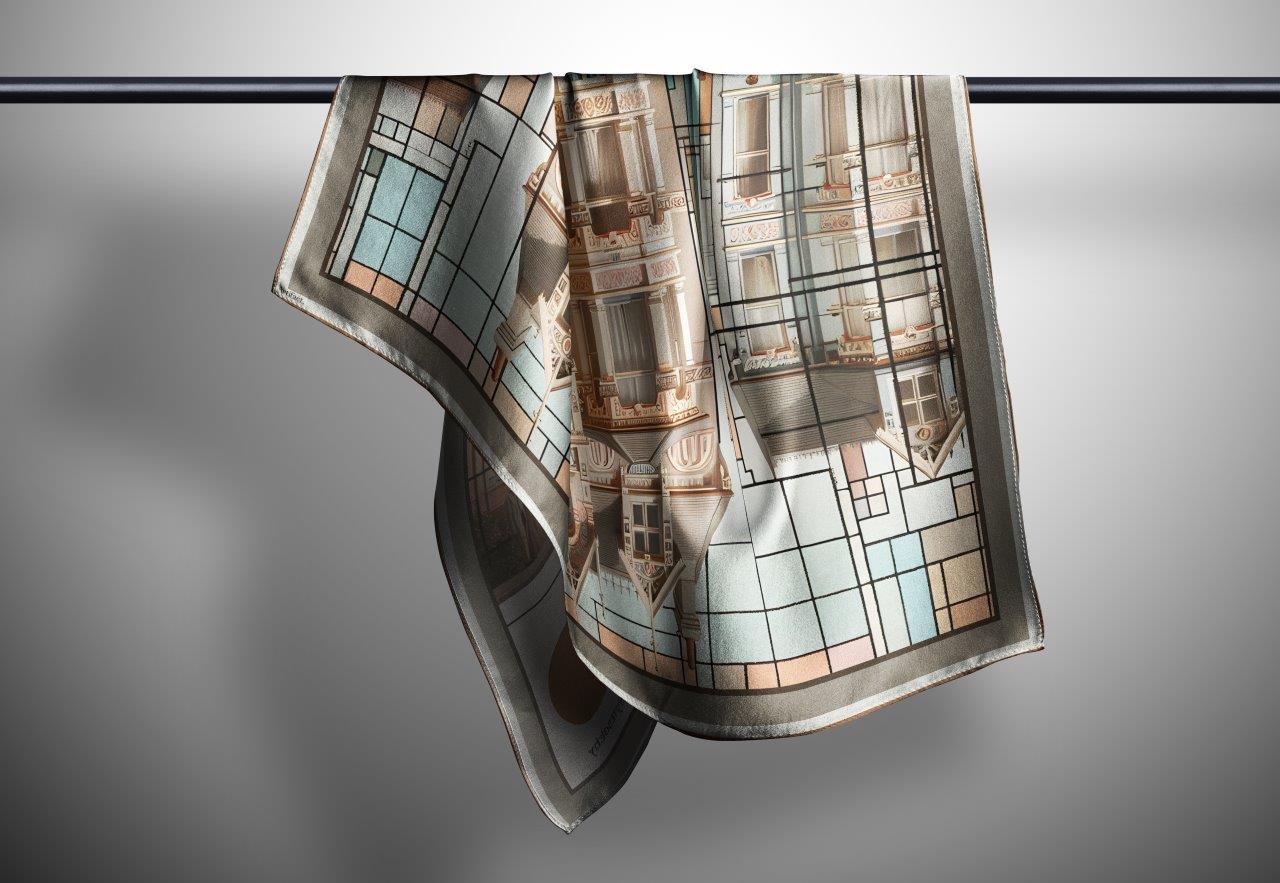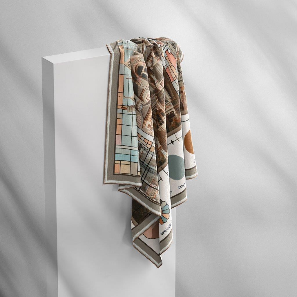 Introducing "Residence," a 90x90cm Silk Scarf designed exclusively for ladies, blending vintage opulence with contemporary artistry. Meticulously crafted from premium silk twill and finished with a rolled hem, this luxurious scarf showcases an intricate Victorian residence with a modern color-blocked twist. Combining shades of linen, sage green, and tan, it offers a fresh interpretation of timeless architectural beauty, creating a wearable masterpiece ideal for women seeking sophistication in their silk scarves.